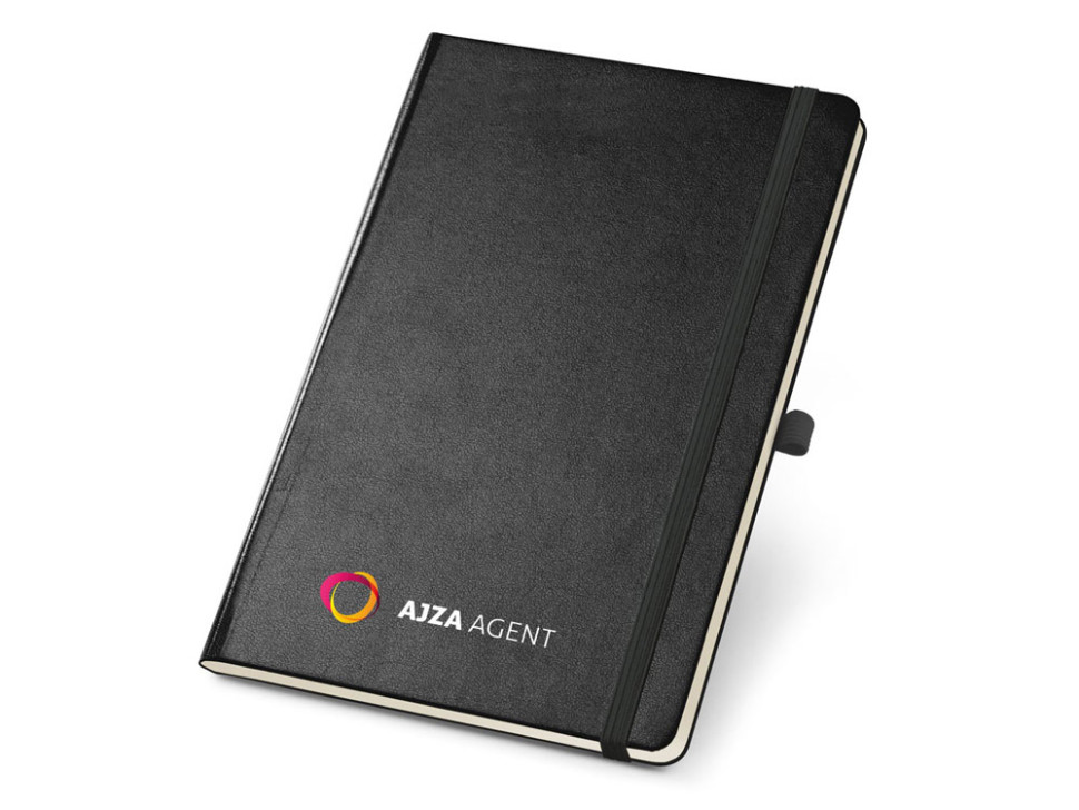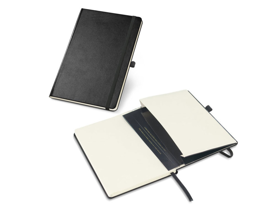Блокнот формата A5 на 160 чистых страниц цвета слоновой кости, твердая обложка, внутренний карман, разделительная лента, резинка и имеет держатель для шариковой ручки (ручка в комплекте).